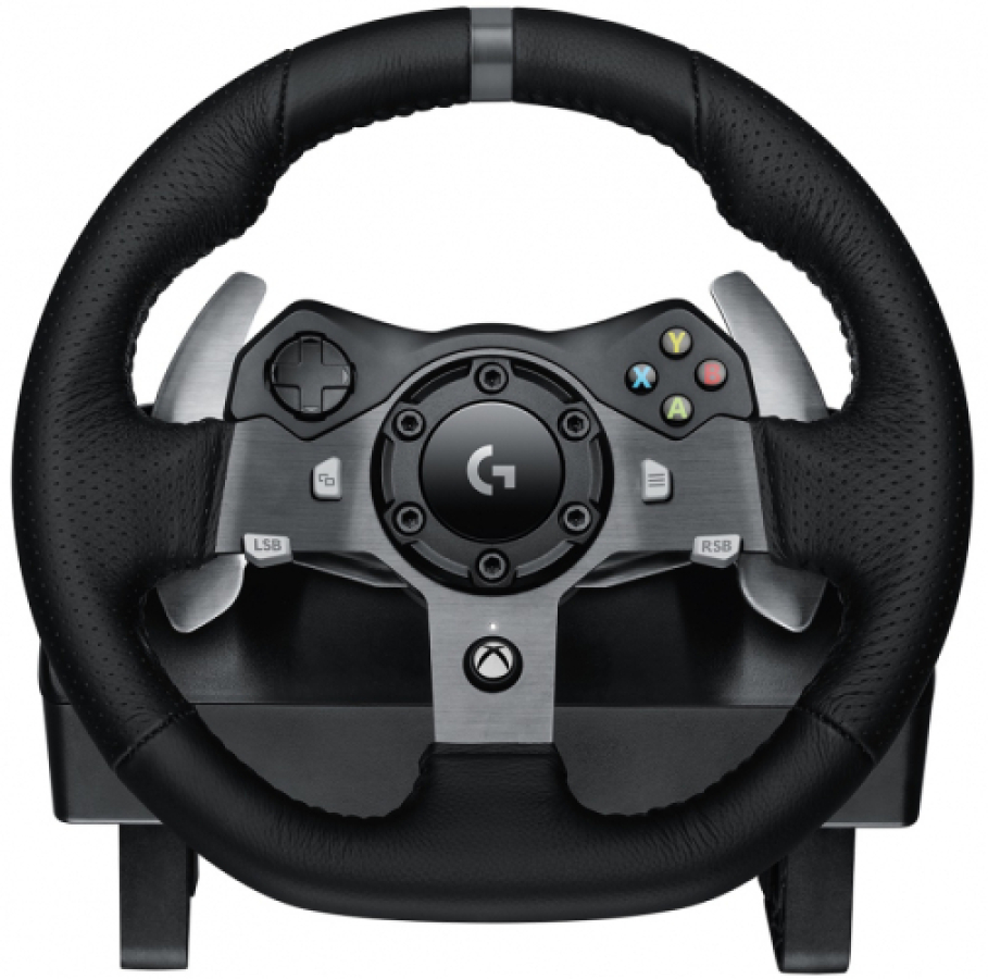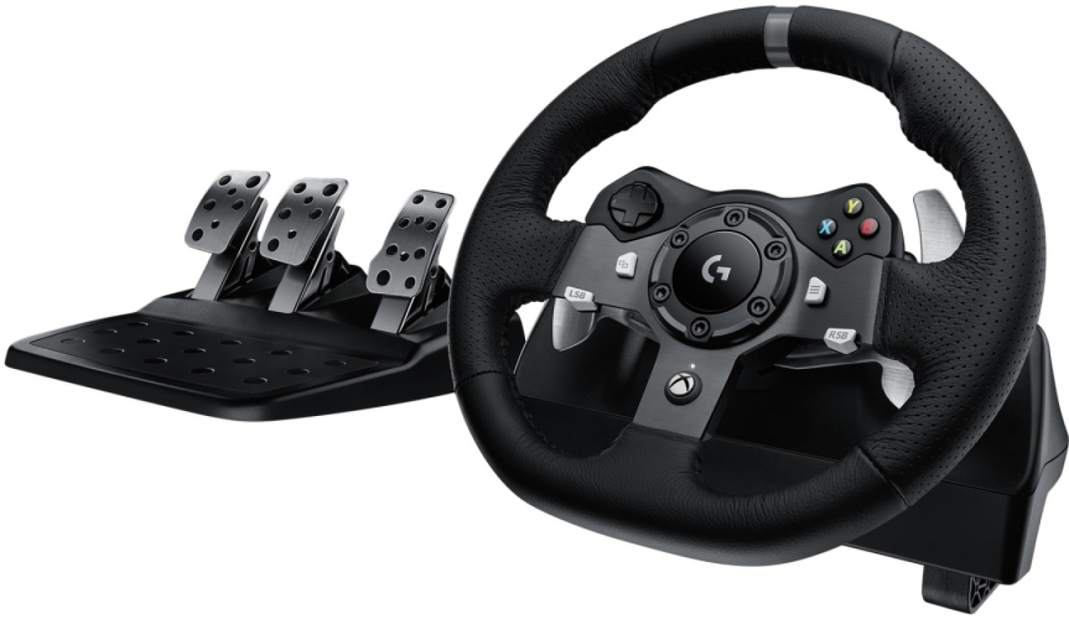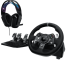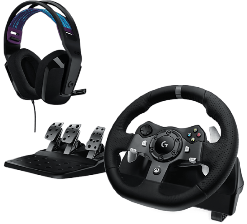 The set includes steering wheel and pedals, headphones